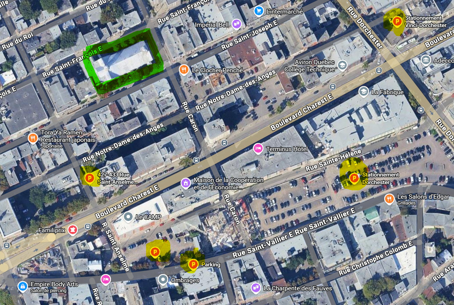 Stationnement Indigo Québec – Tour Place Jacques Cartier – 380 Rue de la Couronne. Stationnement couvert, situé près de la place Jacques‑Cartier, paiement par carte (crédit/débit), accès PMR.