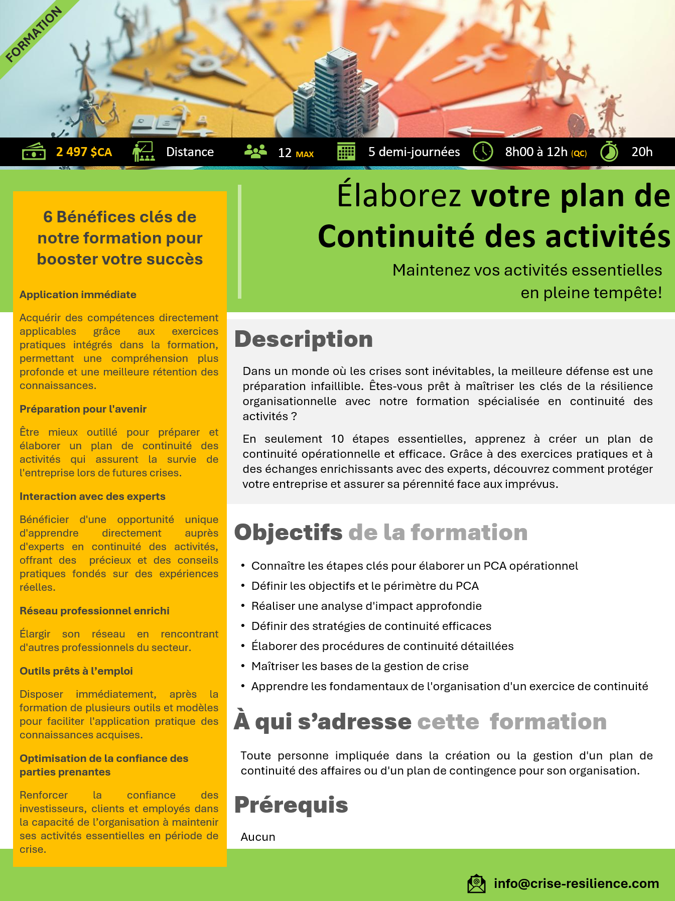 Bénéficiez d'une formation qui allie théorie et pratique, conçue spécifiquement pour faciliter la mise en place d'un plan de continuité d'activité simple et efficace. Allez à l'essentiel pour une meilleure résilience.