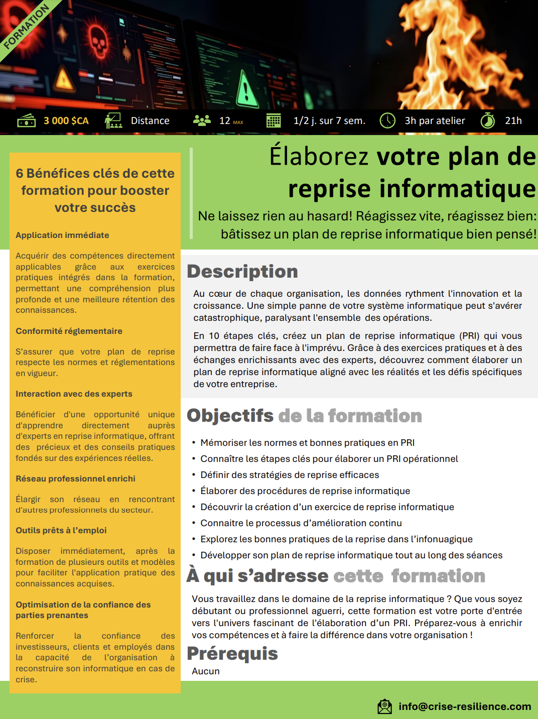 Vous travaillez dans le domaine informatique ? Que vous soyez débutant ou professionnel aguerri, cette formation est votre porte d'entrée vers l'univers fascinant de l'élaboration d’un PRI. Préparez-vous à enrichir vos compétences et à faire la différence dans votre organisation !